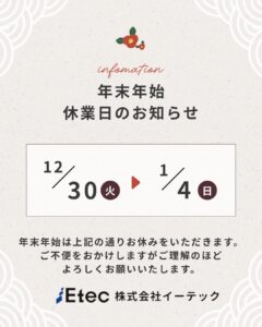 イーテックは 12月30日〜1月4日の期間、お休みをいただきます。